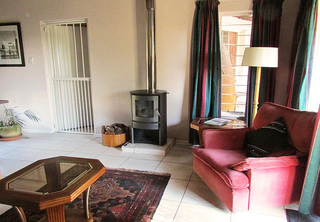 The stunning suite has a warm, comfortable lounge area with a log fireplace, a Persian rug, a coffee table, cosy couches and a TV with DStv. There is a breakfast bar opening into the kitchen, which is equipped with a microwave, fridge, toaster, kettle, crockery and cutlery, just enough to prepare very basic meals.