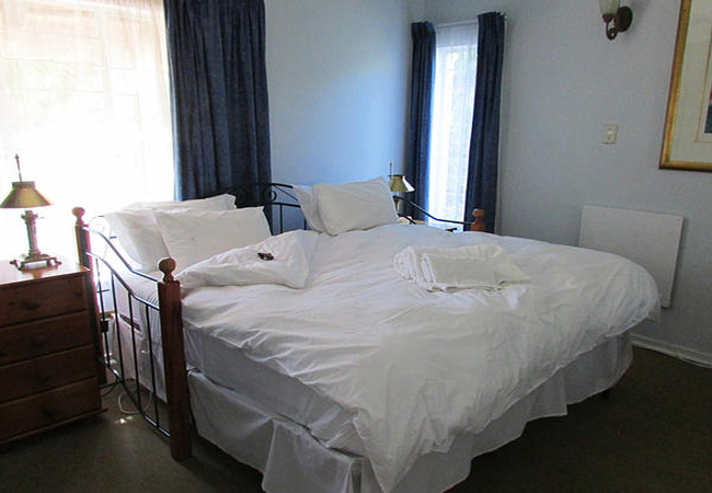 Off the lounge area is the double bedroom, which boasts a king size bed with luxury linens and an office area. There is a combination lock safe to store your valuables.