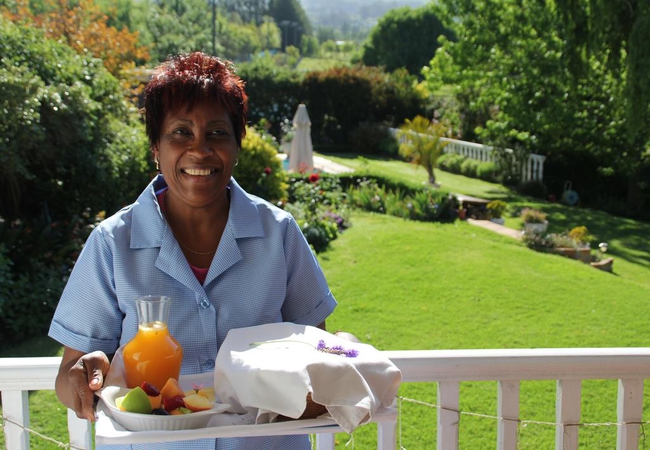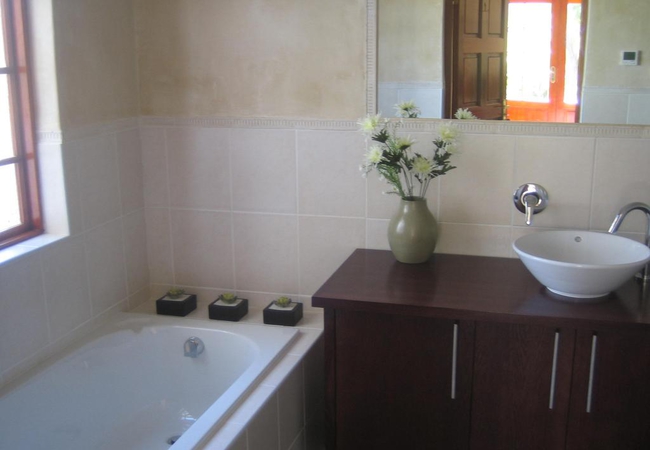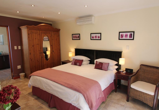 This large open plan room is situated above the Jacaranda suite and has a King bed (extra length), fully equipped kitchenette and bathroom with shower and bath. There is also a large flat-screen television with satellite tv (all channels)and a PVR. The bedroom has double doors opening out onto your own balcony, with views to the paddocks next door. On a clear day you can see the Cape Peninsula. Your entrance balcony also has similar views. There is also a solar heated, saltwater pool and large beautiful gardens with paddocks and of course wonderful mountains views. Please note that this room is accessed via stairs.