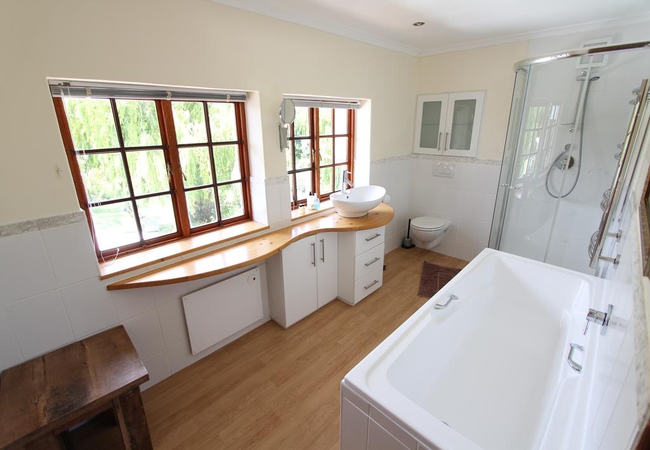 The bedroom has double doors opening out onto your own balcony, with views to the paddocks next door. On a clear day you can see the Cape Peninsula. Your entrance balcony also has similar views. There is also a solar heated, saltwater pool and large beautiful gardens with paddocks and of course wonderful mountains views...