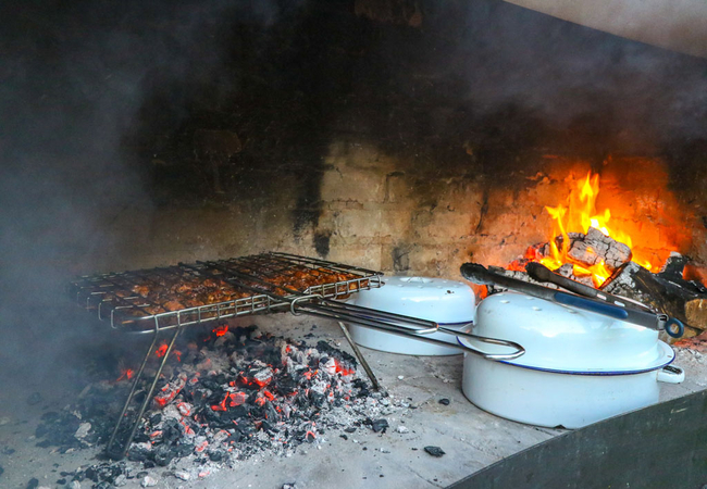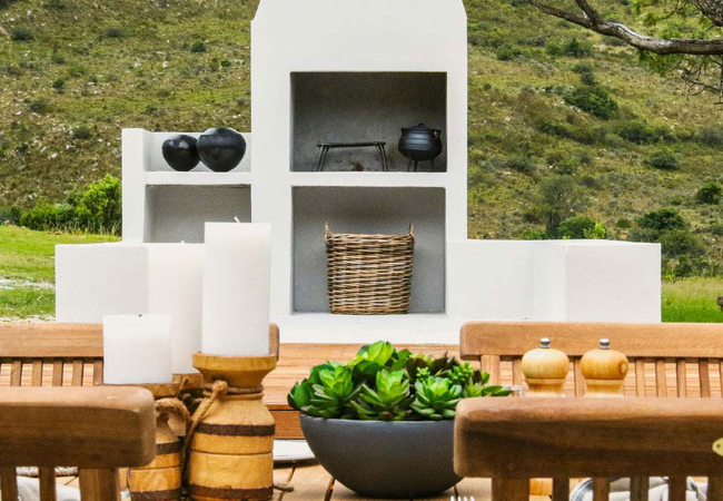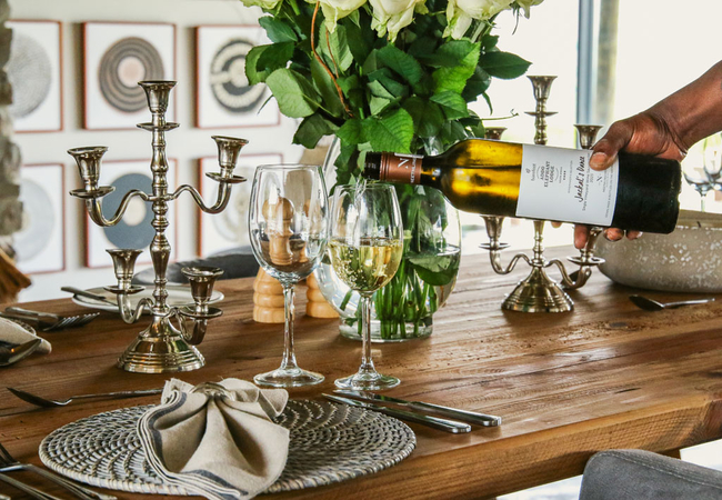 The villa has an open plan lounge, bar area and dining space with a fireplace. There are indoor and outdoor dining options and braai facilities. The kitchen is fully equipped with everything needed for a luxury self-catering break, including a gas cooker.