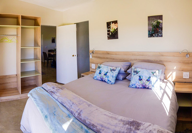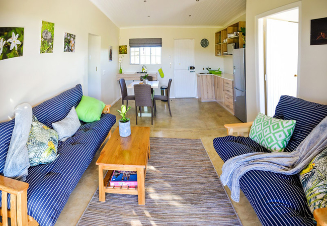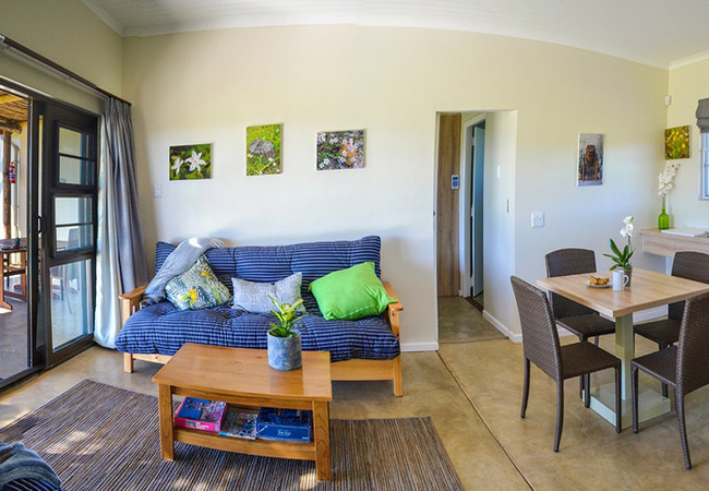 Cottage 2 can sleep four adults and two children and has one air-conditioned bedroom furnished with twin beds that can be converted into a Queen-size bed. There is one bathroom fitted with a shower, basin and toilet. The open-plan living area has two sleeper couches for two children to sleep on. The adjacent well equipped kitchen contains a fridge, a microwave, a two-plate gas stove, kettle and a toaster. Guests have access to the braai area located near to the cottage.