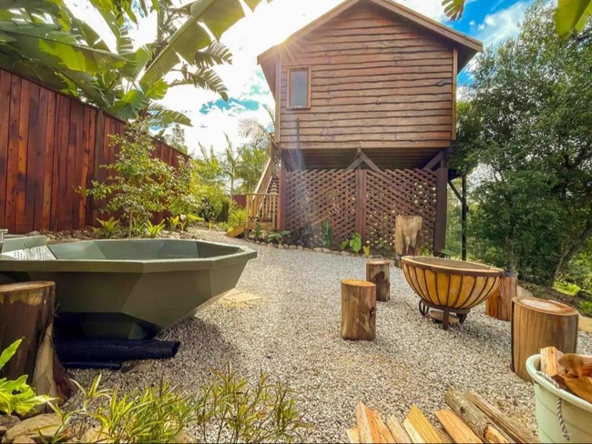 Forest Chalet One has two en-suite bedrooms each furnished with a Queen-size bed. The en-suite bathrooms have a lovely bathtub, shower, hand basin, WC and complimentary toiletries. The open-plan kitchen is equipped with a refrigerator, gas stove, washing machine, tea and coffee facilities, and facilities to cater for yourselves. The living area has comfortable seating and a TV with streaming services. It opens to a covered deck with outdoor furniture. There is a private entertainment area with a BBQ and a hot tub downstairs.