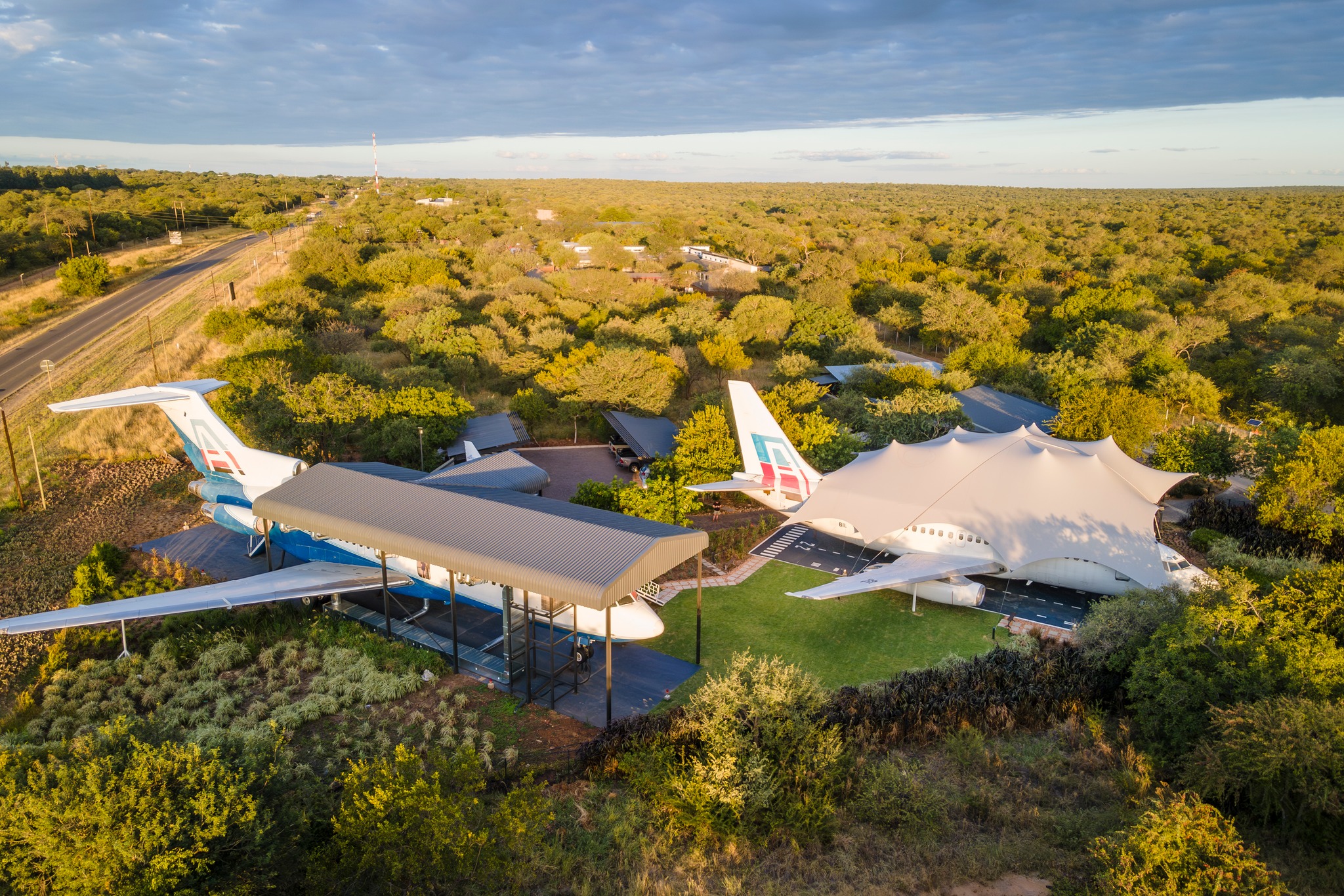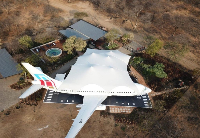 Aerotel, a boutique aviator hotel, offers unique accommodation in Hoedspruit, Limpopo. Experience the thrill of spending a night on-board a Boeing 737-200, or Boeing 727 private jet overlooking the African bushveld and the northern Drakensberg mountains. The hotel is located 64 km from Kruger National Park's Orpen Gate for those wishing to visit the park.
