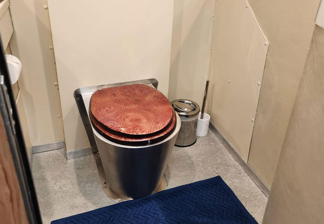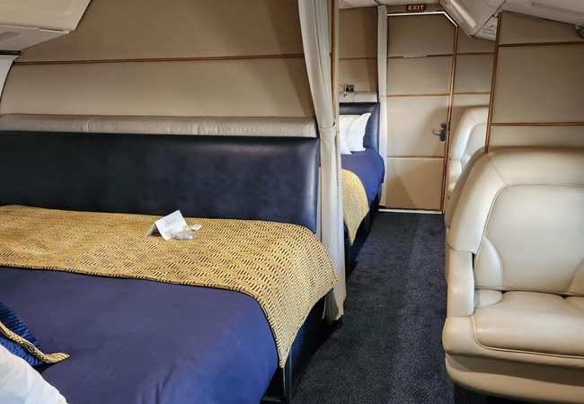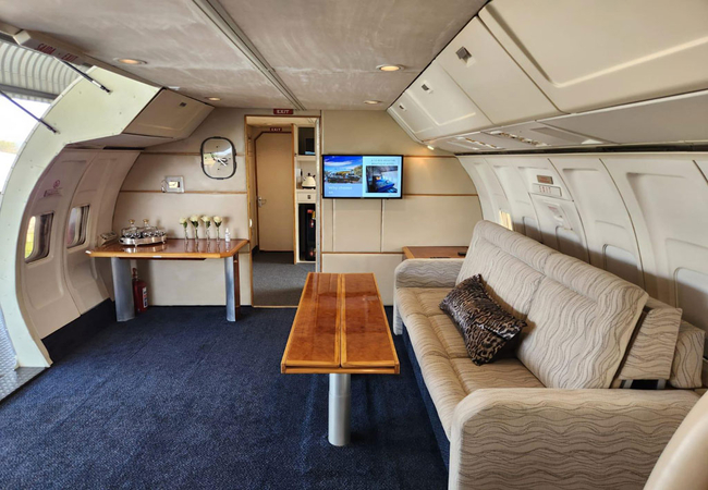 The Business Class accommodation has separate rooms in a Boeing 727. The First Class accommodation is in a private jet with three bedrooms, two bathrooms, a kitchen area with mini-bar and coffee station. There is a private deck looking out onto the mountain.