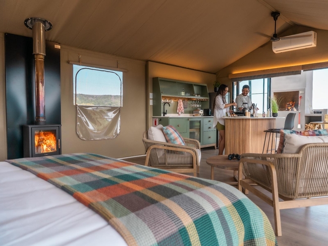 The Premium Tent (Hot Tub) is a spacious, open-plan retreat designed for couples, featuring a king-size bed, indoor fireplace, comfortable lounge seating, and a modern fully equipped kitchen. Guests can relax in the outdoor wood-fired hot tub or enjoy the private patio with outdoor dining and braai facilities. The tent includes an en suite bathroom with a walk-in shower and is equipped with air conditioning, Wi-Fi, cleaning service, and thoughtful amenities such as an electric blanket, coffee and tea station, and quality furnishings for a comfortable, non-smoking stay.