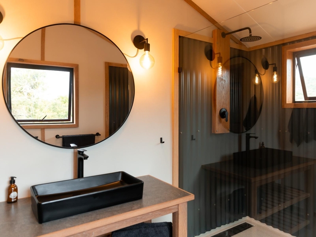 AfriCamps at De Pakhuys tents consist of an outdoor wood-fired hot tub or splash pool, a spacious open plan lounge area with a comfortable couch, a dining area with a solid wooden table and seating for five guests, a fully-equipped kitchen, two bedrooms that comfortably sleeps five guests, and a bathroom fitted with a hot shower, flushing toilet, and washbasin.
