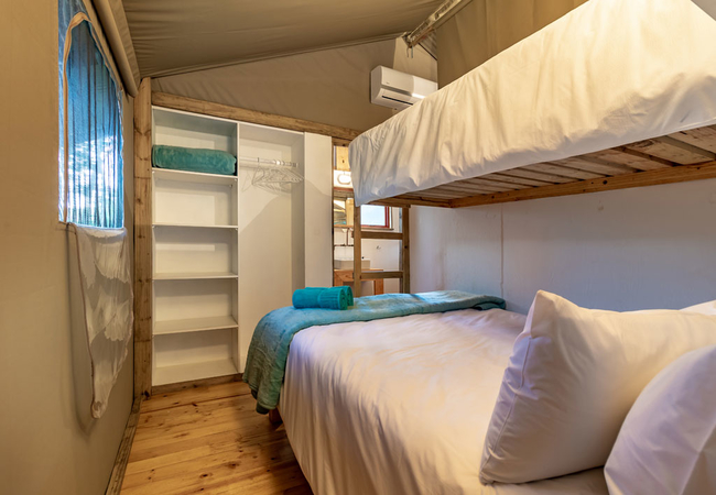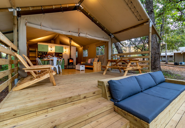 This boutique self-catering glamping tent offers a stylish and comfortable escape, featuring a lounge, dining area, and a spacious wooden deck to enjoy the outdoors. The tent accommodates up to five guests across two bedrooms, each furnished with a queen-size bed, while one also includes a single bunk bed.