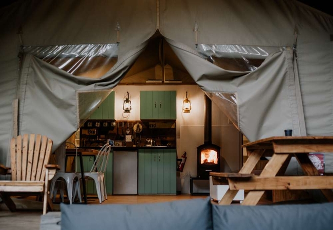 This boutique self-catering glamping tent offers a stylish and comfortable escape, featuring a lounge, dining area, and a spacious wooden deck to enjoy the outdoors. The tent accommodates five adult guests across two bedrooms, each furnished with a queen-size bed, while one also includes a single bunk bed. A well-equipped full kitchen ensures convenience, and the bathroom features a shower. Thoughtful amenities such as air conditioning, a fireplace, and coffee and tea facilities enhance the stay. This is a non-smoking accommodation.