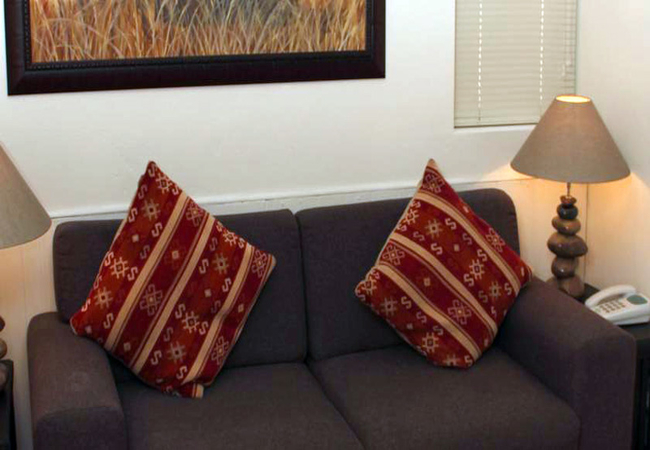 This family suite is decorated in chocolate browns and creams. It comprises two bedrooms, main furnished with a king-sized bed and the second room furnished with two single bunk beds. The lounge has a comfortable sleeper couch and the ensuite bathroom has a corner spa-bath and separate shower.