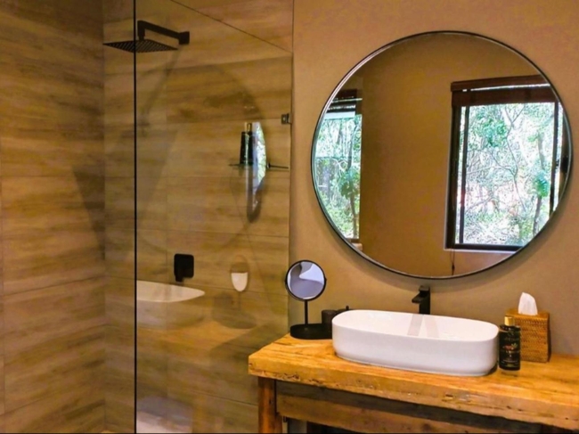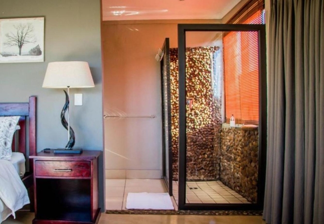 This spacious room with an en-suite stone shower and large sliding glass windows have a majestic view over the river and valley bushveld. Furnished with a King size bed and built-in cupboards. A snooza mattress can be added for children.
