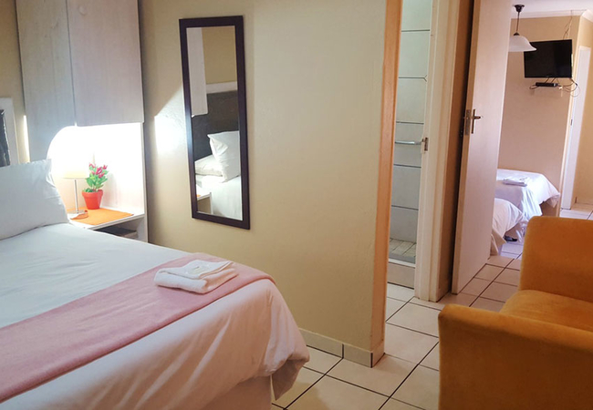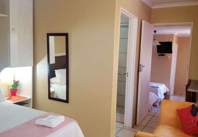 This unit has two bedrooms, with one bathroom a small kitchen for basic self catering. Lounge area with a TV and DStv. Unit has own private entrance. All the rooms have private en-suite bathrooms, a TV with DStv (hotel package), tea / coffee making facilities and Wi-Fi. Hairdryers, heaters and fans are available on request.