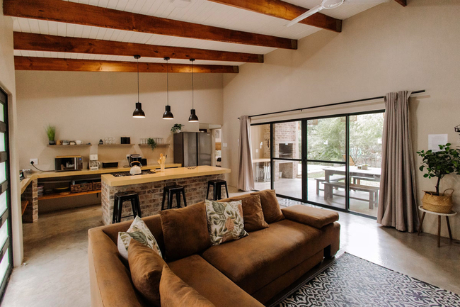 The open-plan kitchen is fully equipped with a fridge-freezer, microwave, oven, gas stove, dishwasher, ice machine, and tea and coffee facilities, ensuring guests have everything needed for a relaxed stay. The adjoining living area offers ample seating, a television, and sliding glass doors that open onto a covered patio with outdoor furniture and a built-in braai, creating an inviting space for social gatherings and al fresco dining.
