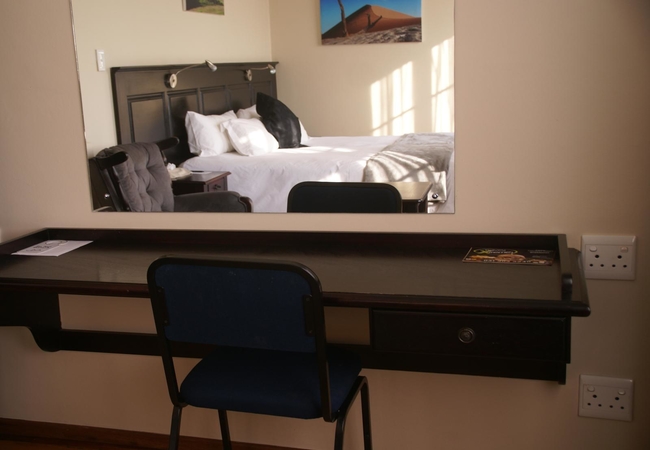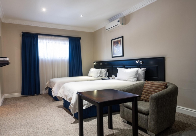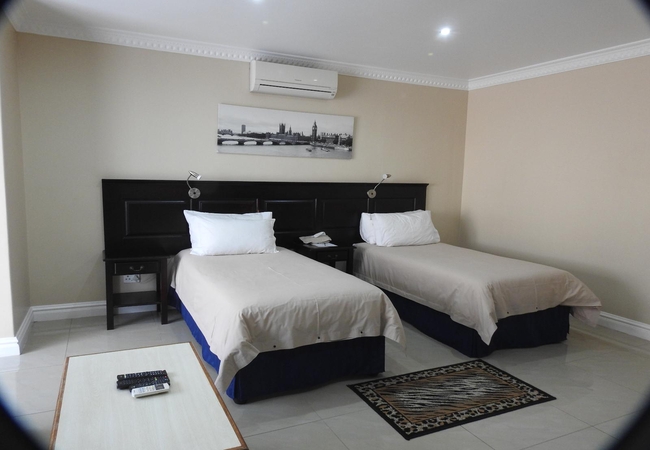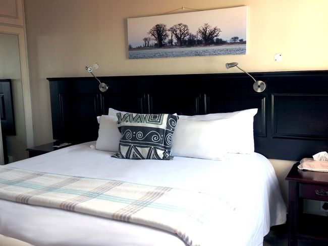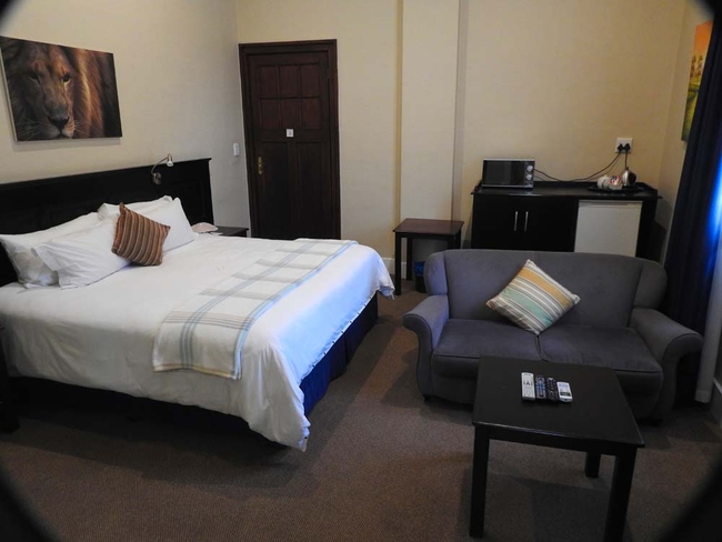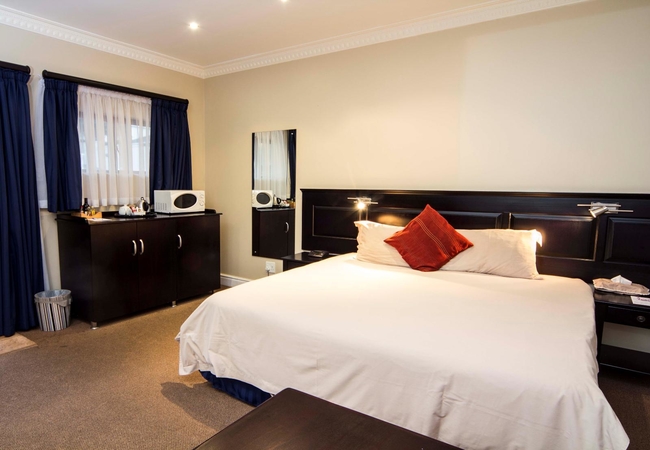 The King Rooms are furnished with a King-size bed. The en-suite bathroom is equipped with a shower, hand basin and WC. Other facilities in the room include flat screen television with a limited DSTV (cable) bouquet, DVD player with access to free DVD library, fully stocked bar fridge, air-conditioned, complimentary internet access, tea and coffee facilities and a microwave.