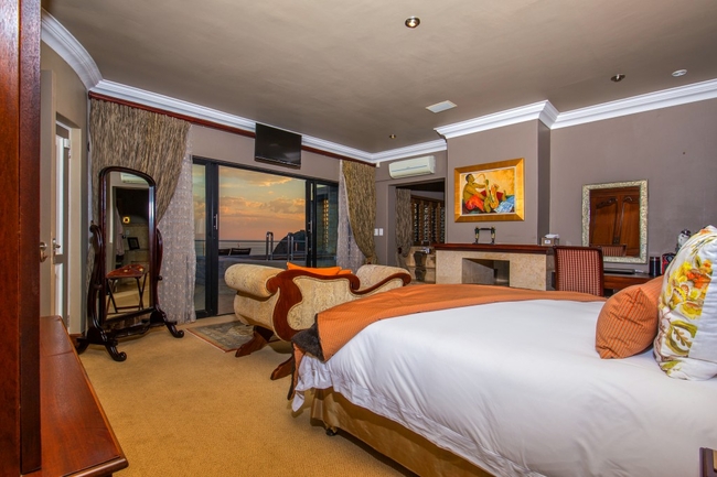 This elegant suite offers sweeping ocean views and features a spacious bedroom with a king-size bed and a full en-suite bathroom that includes both a bath and separate shower. For convenience and comfort, the suite provides Wi-Fi, a television with DStv, air conditioning, and a fully stocked mini and snack bar alongside a coffee station. The indoor lounge opens onto a large, partially covered patio furnished with outdoor seating, creating an inviting space to relax while enjoying the sea views. Guests will also appreciate thoughtful touches such as a fireplace, safe, desk, and turn-down service, as well as premium bathroom amenities that include a hairdryer, bathrobes, and slippers. Designed as a non-smoking retreat, the suite blends luxury and relaxation with a coastal atmosphere.