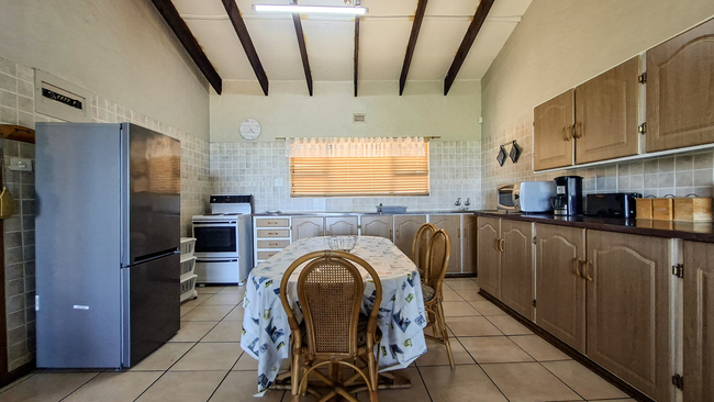 The kitchen is fully equipped for self-catering, including a stove, oven, fridge-freezer, microwave, kettle, and toaster. In the living area, there is a flat-screen TV; however, guests need to bring their own towels and an EXPLORER DStv decoder to access TV channels.
