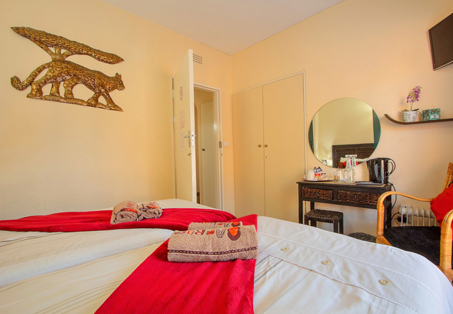 The comfortable Leopard room has two single beds. This room shares a bathroom with the Cheetah Room. Can also be used as a family room in combination with the Cheetah room which has a double bed directly opposite each other with the bathroom in the middle, both rooms are closed off from the rest of the guest house by a sliding door.