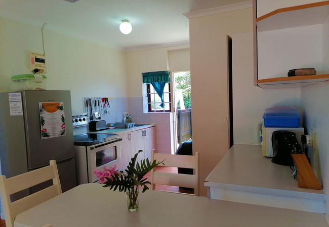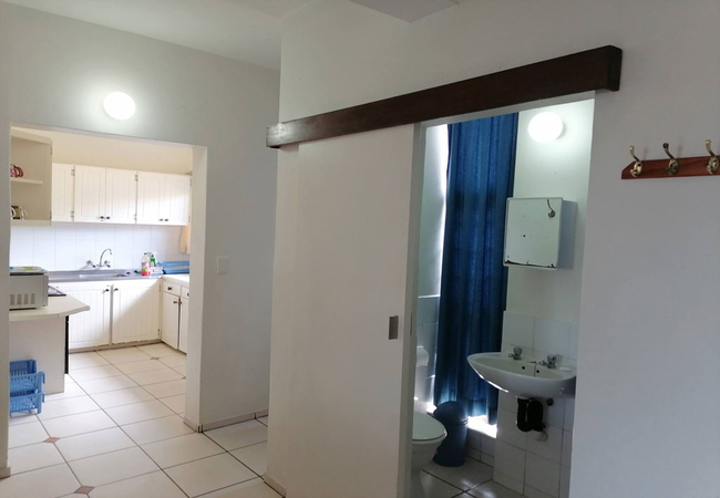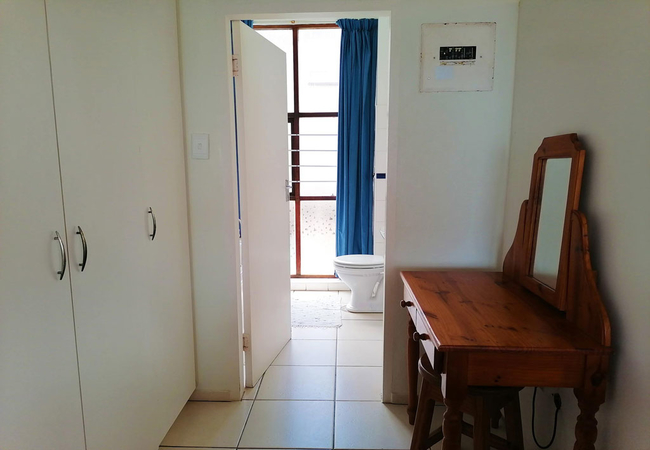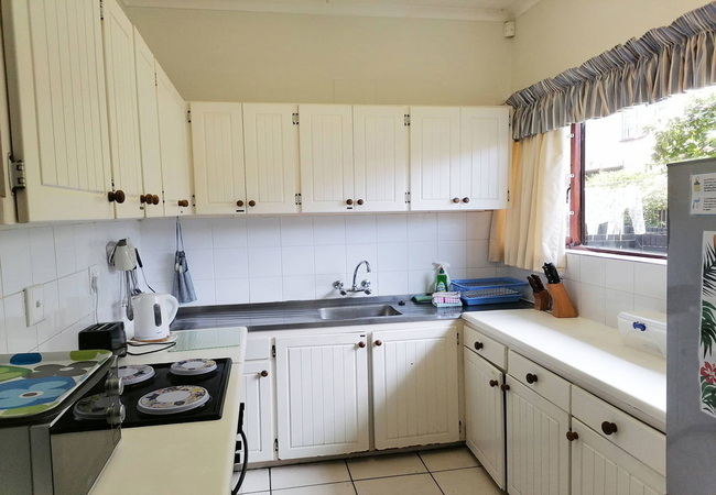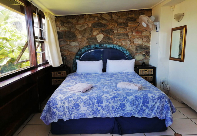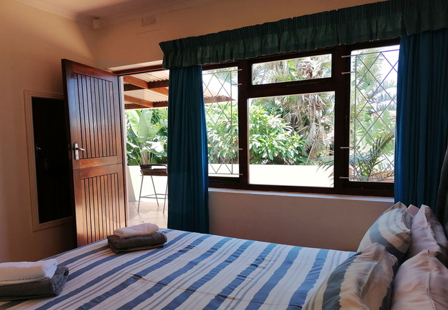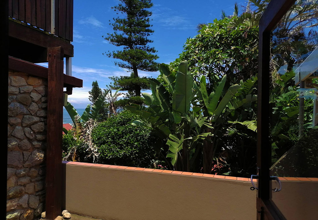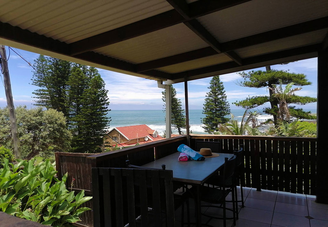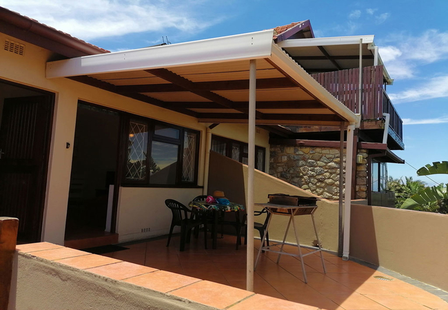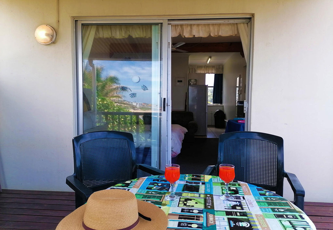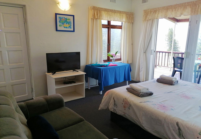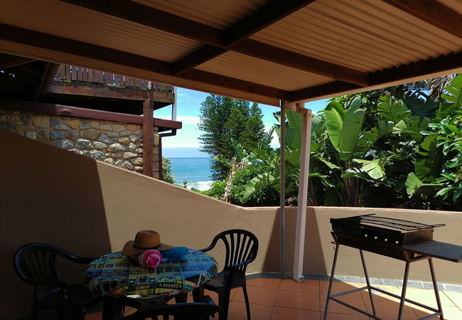 The accommodation, which enjoys stunning sea views and has a lovely private feel, consists of an open-plan bed-sitter with queen bed and ceiling fan, en-suite bathroom with bath and hand-shower, an en-suite kitchen area, and large private patio with your own patio furniture, umbrella and braai. This unit has a covered lock-up carport and safe. The kitchen is fully equipped including a two plate stove and oven, large fridge with freezer, microwave, electric frying pan, cordless kettle, toaster and kitchen utensils. Linen and bath towels are provided.