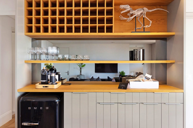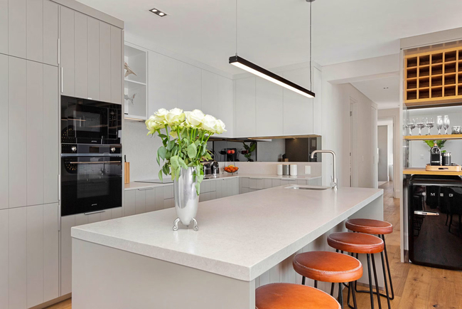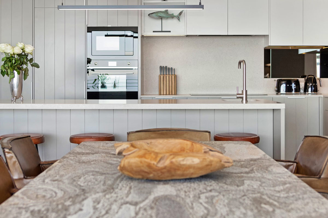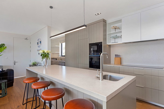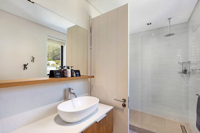 The interior living spaces are designed with a seamless flow, combining a stylish open-plan lounge and dining area with a fully equipped kitchen. The kitchen is fitted with premium appliances, including an integrated fridge, a bar fridge, a large induction hob, a Nespresso machine, as well as cutlery and crockery. A separate scullery houses a dishwasher for added convenience.