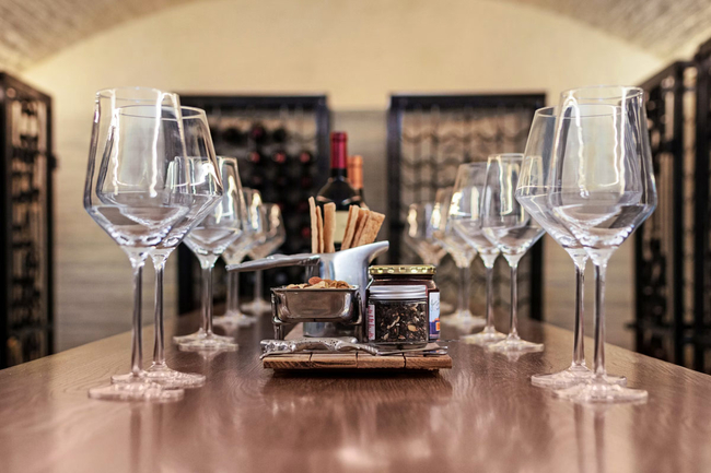 At its heart is a display area furnished with lounge seating and wine-tasting tables. The adjoining network of tunnels has been carefully restored and now serves as an underground wine cellar, offering a distinctive tasting experience within a remarkable heritage setting.