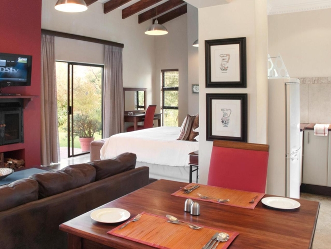 Kingfisher is the ideal romantic getaway for a couple. Whether you relax in your own Jacuzzi on the private patio with magnificent views of Cathkin and Champagne Peaks or participate in the many activities in the Central Drakensberg, the cottage offers a secluded haven for you to relax and unwind! The cottage has an open plan "loft style" area with a King-size bed, lounge, dining and fully equipped kitchen areas. The en-suite bathroom is fitted with a bath, basin, toilet, indoor and outdoor showers. The cottage has a TV with DStv / satellite channels and a DVD player. Outside there is a jacuzzi on a charcoal braai patio with panoramic views of the mountains. There is a swimming pool and fishing dam on site.