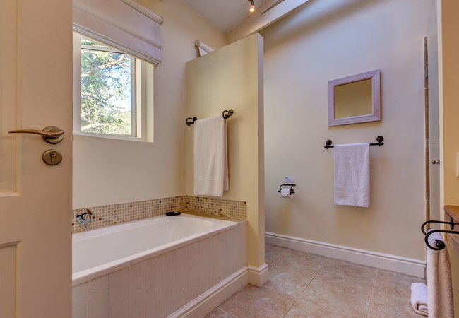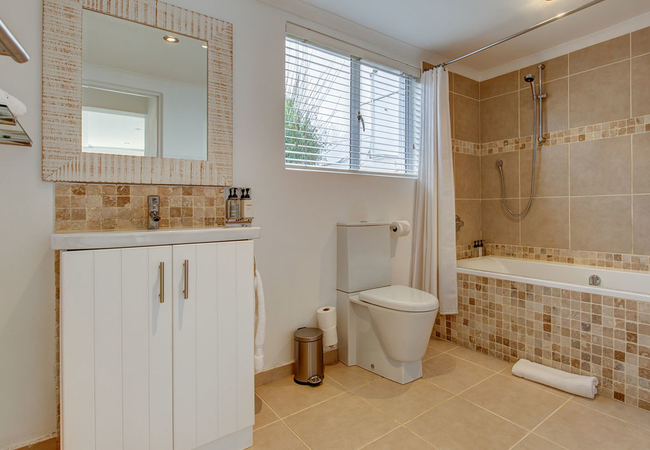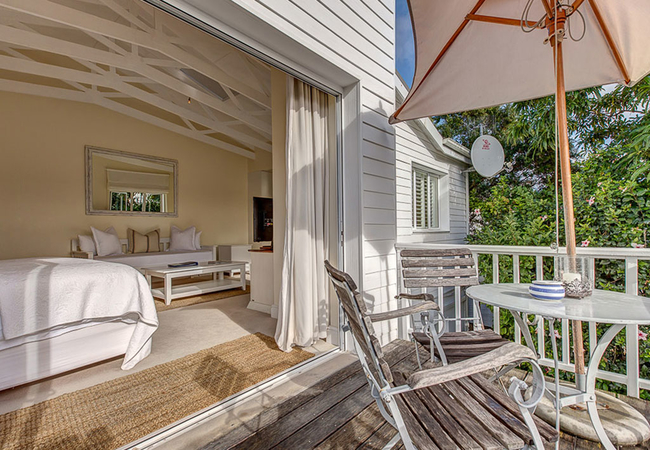 The Deluxe Garden Facing Room is known as our Loerie Suite. It's a private, very spacious and sunny upstairs room with folding doors that open the room out onto a balcony. The private deck is equipped with chairs and table. Views are over the garden and the rooftops of Leisure Isle towards the northern hills of Knysna. The beds can be made up as King or Twins with an optional extra bed for a third person. The en-suite bathroom has a bath, shower and double basins and looks into the boughs of a Milkwood tree. Air-conditioned. As with all suites the room has luxury five star amenities, bar fridge, lounge chair, writing desk, cupboard and storage and free wifi.