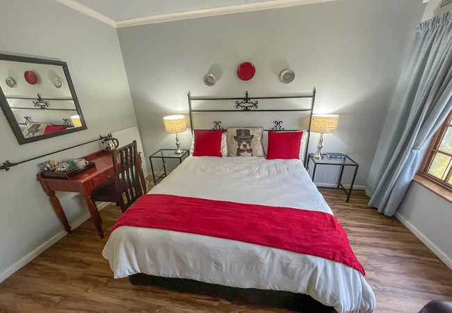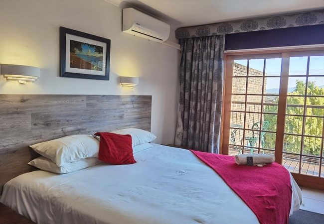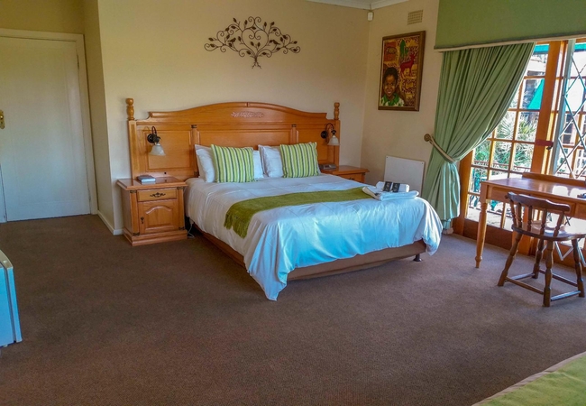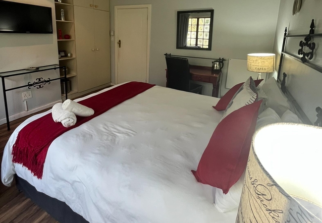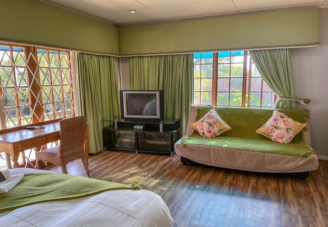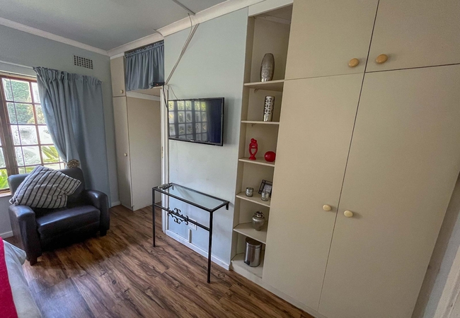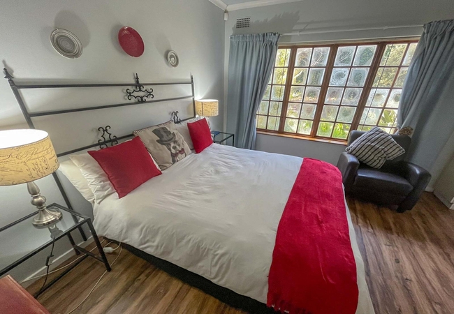 Swallow’s Nest is a cozy and versatile unit, perfect for couples, friends, or a small family. It comfortably sleeps three with a split-king bed (which can be arranged as twins) and an additional single bed. Located outside the main house, it offers a private entrance and overlooks a wooden deck with views of the distant hills. Conveniently situated near parking and gardens, the unit also includes a patio for relaxing outdoors. Amenities include Wi-Fi, a TV with DSTV/Satellite channels, a desk, daily cleaning service, and bathroom amenities with a shower only. Guests also have access to an iron and ironing board, coffee and tea facilities, and a refrigerator. The unit is non-smoking, ensuring a fresh and welcoming atmosphere.