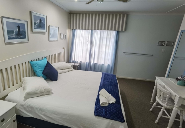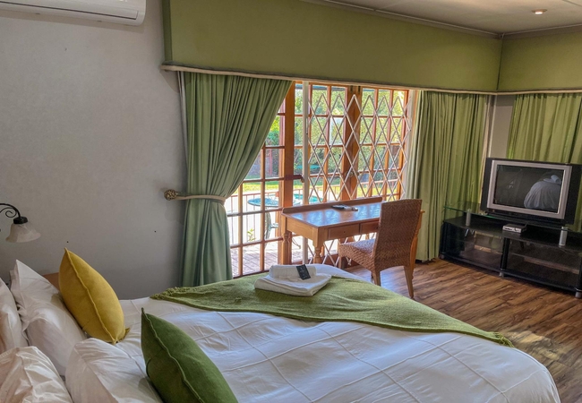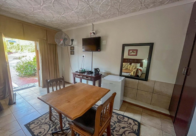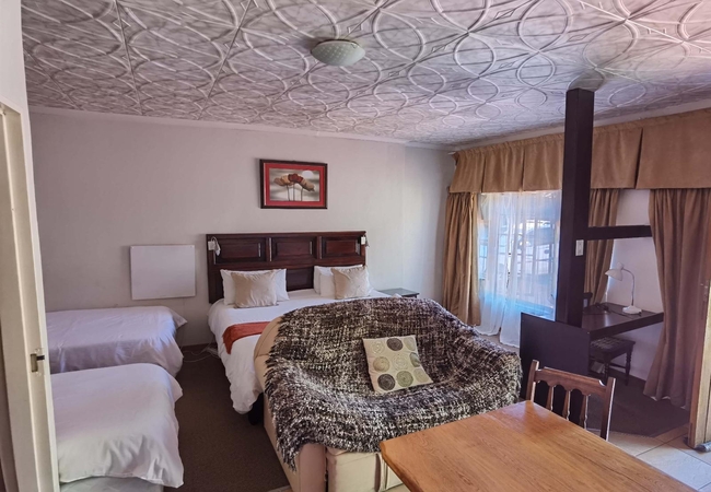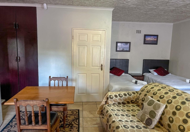 Palm View is a spacious and family-friendly unit offering distant mountain views, making it a peaceful and convenient base in a lovely setting. The main room features a king bed and a ¾ bed, while an adjacent room includes two single beds, comfortably accommodating up to five guests. The unit is non-smoking and equipped with a range of amenities, including Wi-Fi, a TV with DSTV/Satellite channels, a desk, and daily cleaning service. Additional features include bathroom amenities with a shower only, an iron and ironing board, coffee and tea facilities, and a refrigerator.