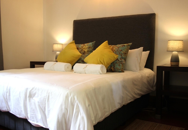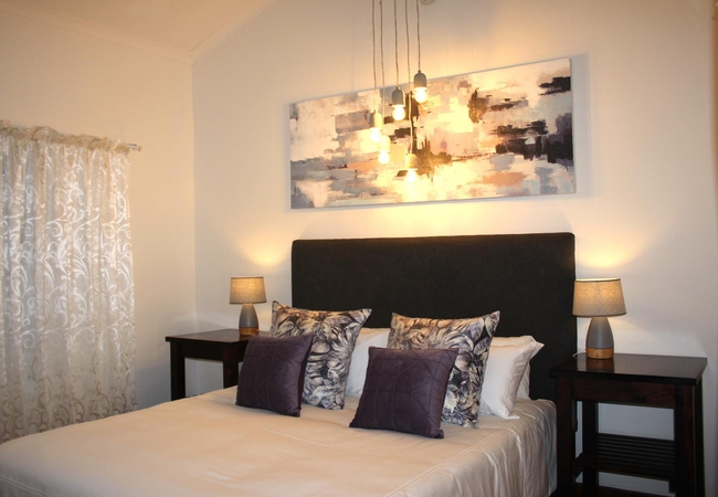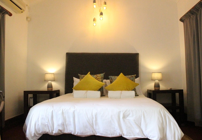 The air-conditioned Queen Room is furnished with a queen bed and an en-suite bathroom fitted with a shower, toilet and basin. The room has a private entrance, front verandah, and courtyard with an additional outdoor shower. Each room has a hospitality tray, bar fridge, and TV with DStv.