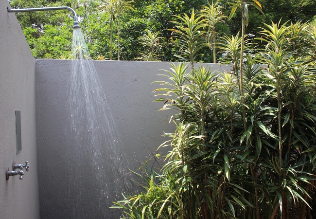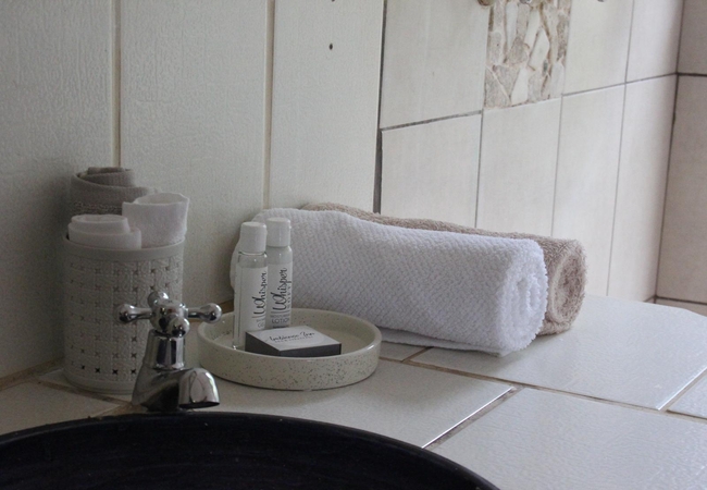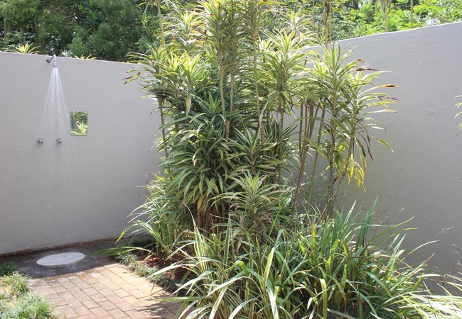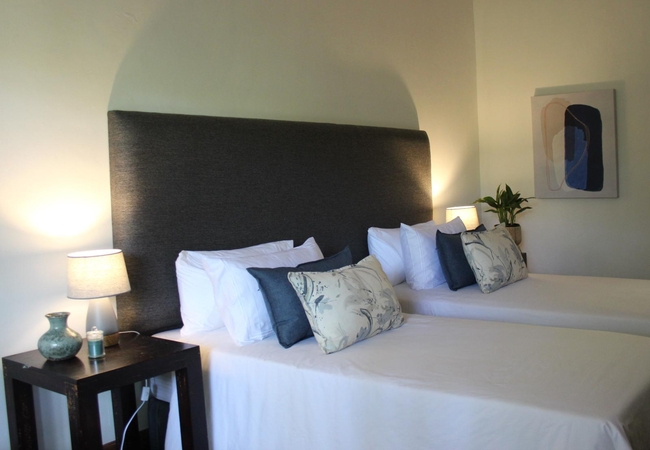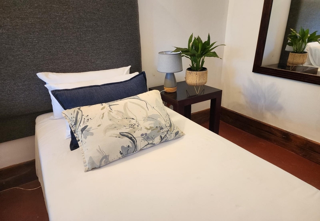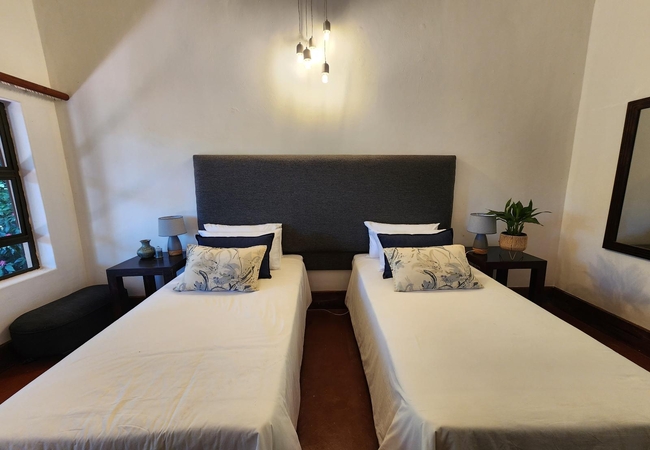 The en-suite Twin room is furnished with two single beds that converts to a King-size bed and an en-suite bathroom fitted with a shower, toilet and basin. The room is air conditioned and has a private entrance, front verandah, and courtyard with an additional outdoor shower. Each room has a hospitality tray, bar fridge, and TV with DStv.