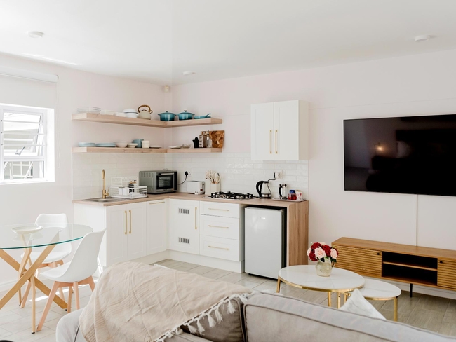 Each thoughtfully appointed holiday apartment has been designed with both comfort and practicality in mind. Featuring a private entrance, a peaceful patio, and a seamless open-plan layout, the units include a fully equipped kitchen and a comfortable lounge area fitted with a flat-screen television. Complimentary Wi-Fi and secure private parking are provided for added convenience.