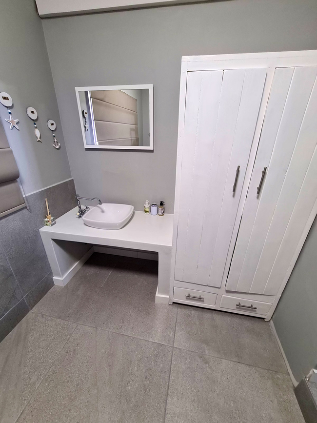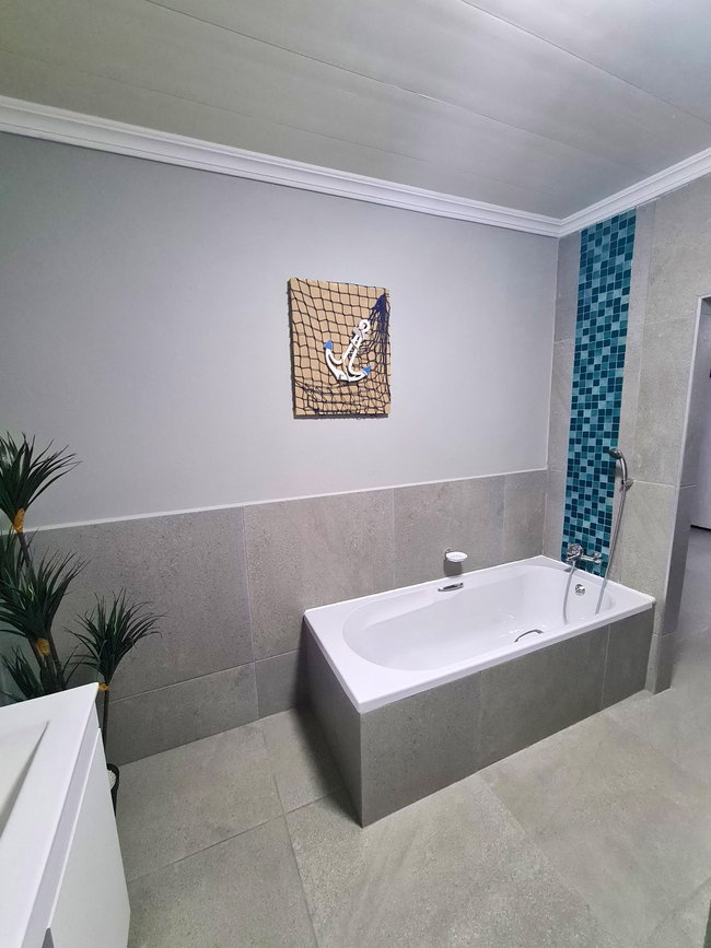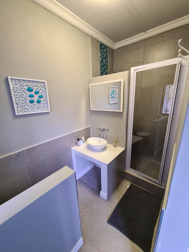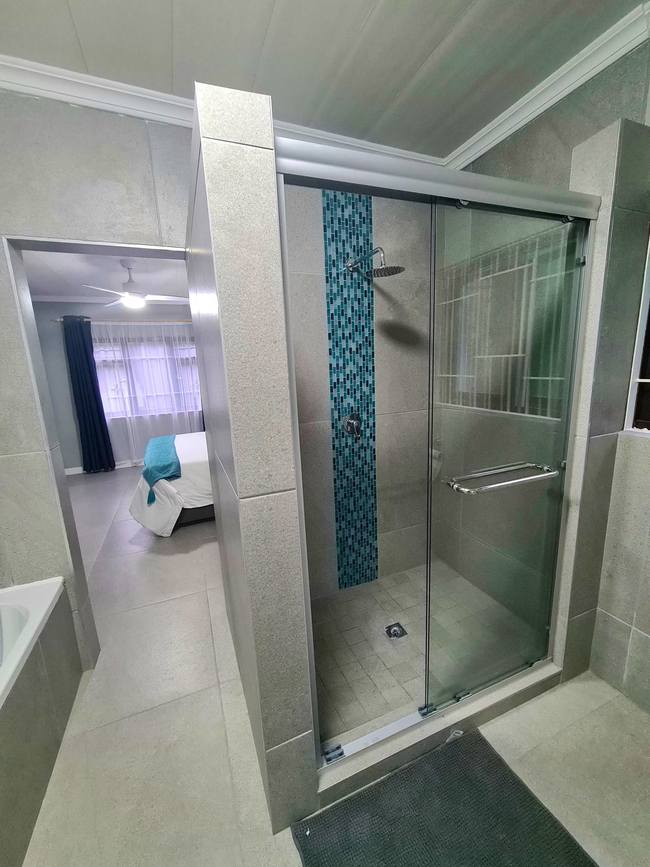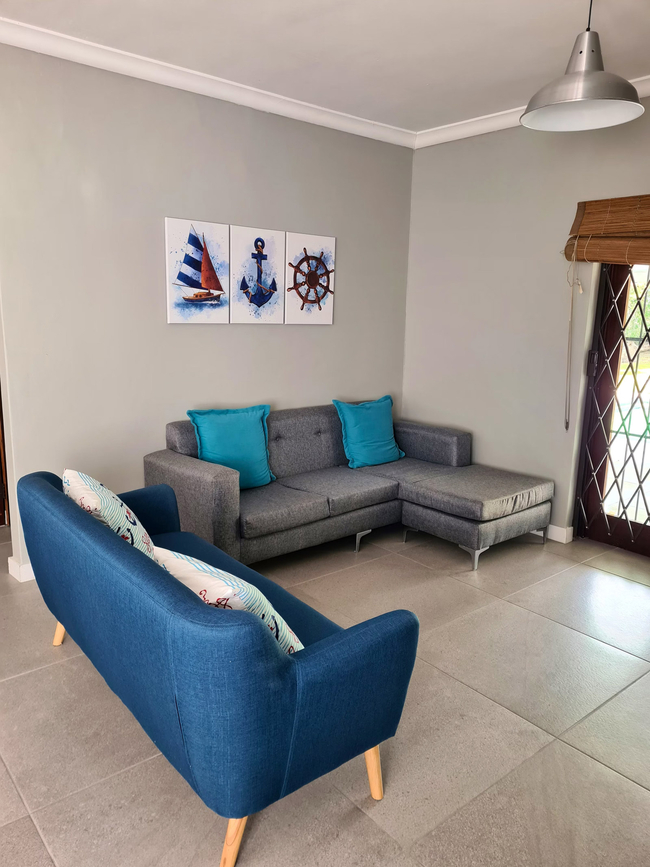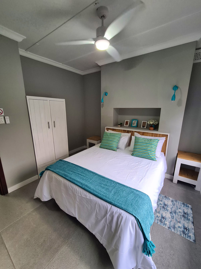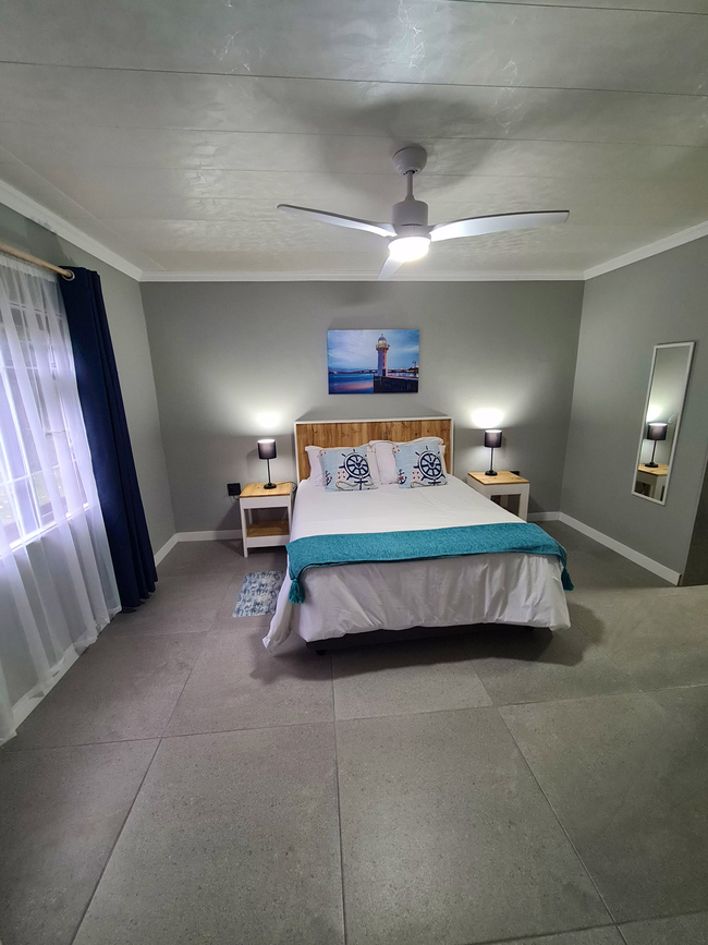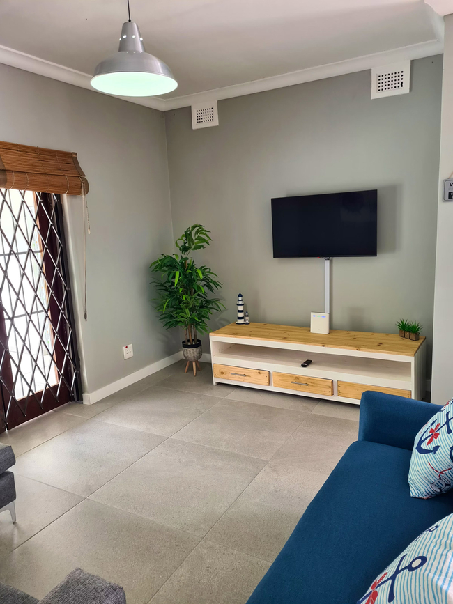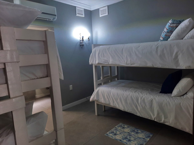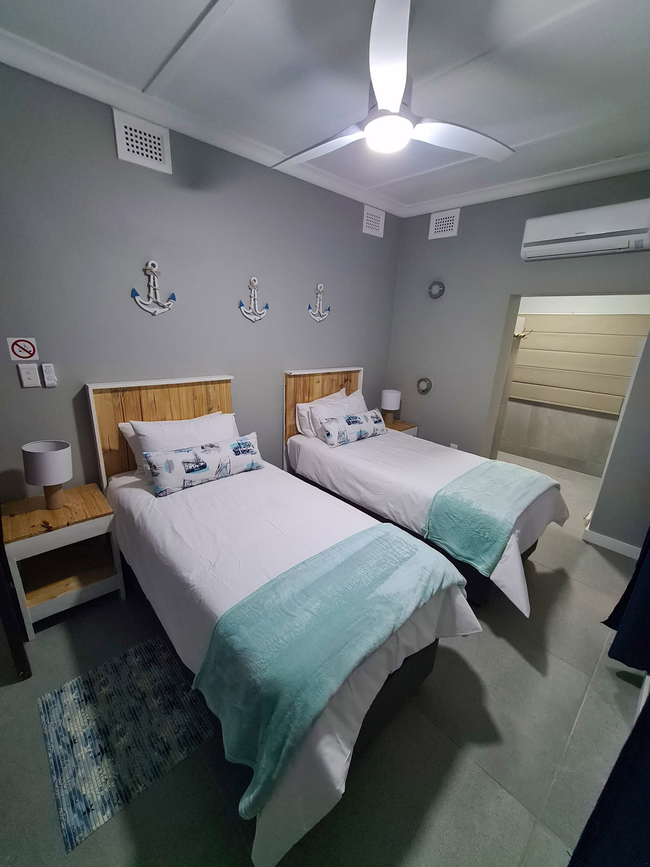 Anchors Rest has four bedrooms with en-suite bathrooms. Two of the bedrooms are furnished with Queen-size beds and the third bedroom has two adult size bunk beds. The fourth bedroom is furnished with two single beds. All four bedrooms have an en-suite bathroom fitted with shower, toilet and basin. The main bathroom also has a bath tub. There is a separate guest toilet with basin. All bedrooms have ceiling fans and wardrobes. Bedding, bath towels and beach towels are supplied. The house includes an open plan lounge and dining room with a 40" Flat screen TV with Netflix and access to DStv Now. The kitchen offers a fridge freezer, gas stove, electric oven, microwave and dishwasher. Starter packs of milk, tea and coffee are provided. Anchors Rest boasts an undercover veranda with outdoor dining and lounge areas and a built in braai which extends to the chlorinated pool. The property is fully fenced and secure with advanced security systems and security beams.