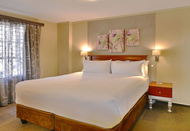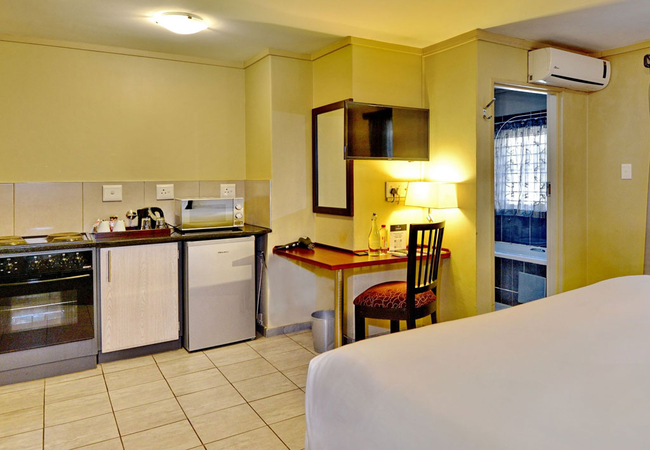 The Standard Apartments are equipped with a separate living room to relax before going to bed. Each Standard One-Bedroom Apartment is furnished with a Queen-size bed. The en-suite bathroom is equipped with a shower, bath, hand basin and toilet. They are also equipped with a kitchenette that consist of a mini bar fridge and microwave. Please note that these rooms are non-smoking. Other facilities include air conditioner, hairdryer, electronic safe, tea and coffee making facilities, complimentary Wi-Fi, flat screen TV and DStv.