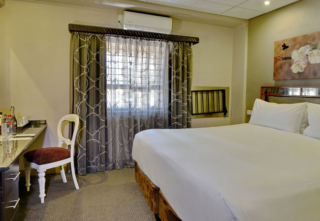The standard rooms are furnished with a Queen-size bed. The en-suite bathroom is equipped with a shower, hand basin and toilet. Each one of our 17 standard rooms are decorated with modern furnishings and double-glazed windows to enjoy a peaceful night's rest. Our rooms are equipped with a working desk, flat screen TV with DStv, individual controlled air conditioning, tea and coffee making facilities, electronic safe, hairdryer and telephone. Enjoy the complimentary amenities provided in the en-suite bathroom.