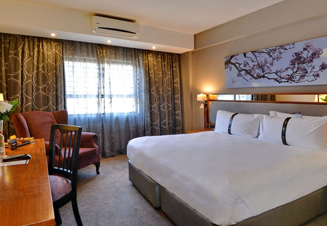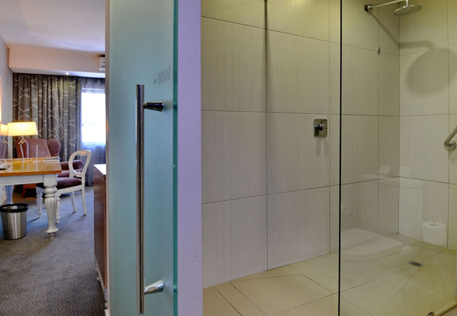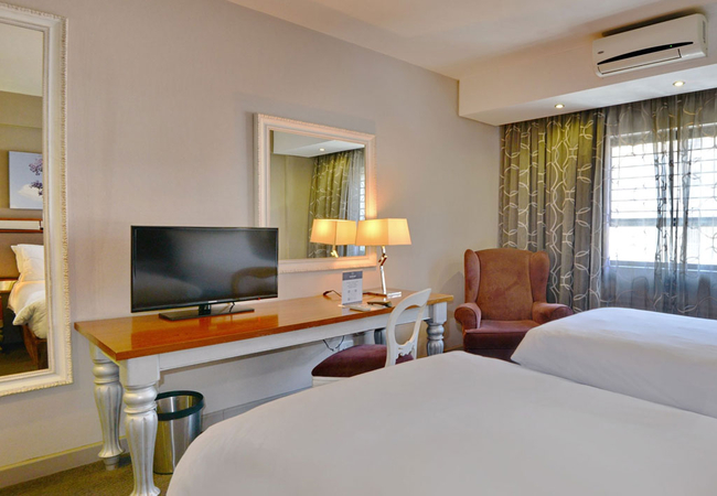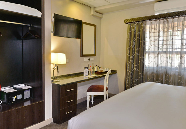 The deluxe room is furnished with a King-sized bed making it perfect for leisure and business travellers alike. The en-suite bathroom is equipped with a shower, toilet and hand basins. Indulge in a hot beverage from the in-room coffee and tea station, while you enjoy your favourite premium channels or in-room entertainment. Other facilities include air conditioner, hairdryer, electronic safe, tea and coffee making facilities, Complimentary Wi-Fi, flat screen TV and DStv.