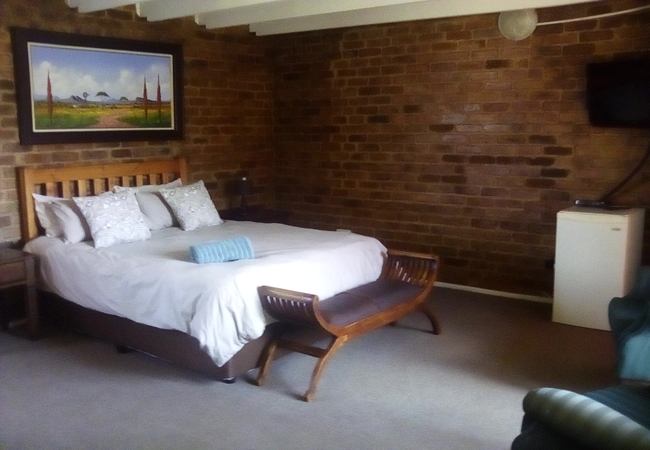 The Luxury King Room is furnished with a King-size bed and has TV with DStv. The en-suite bathroom has a shower only. Balcony/patio, Upstairs, Garden views, Tea and Coffee Facilities, Bar Fridge, No Smoking in Rooms. All rooms have en-suite bathroom and contain tea and coffee facilities. There is safe parking on the premises and the lodge employs a 24 hour security policy.
