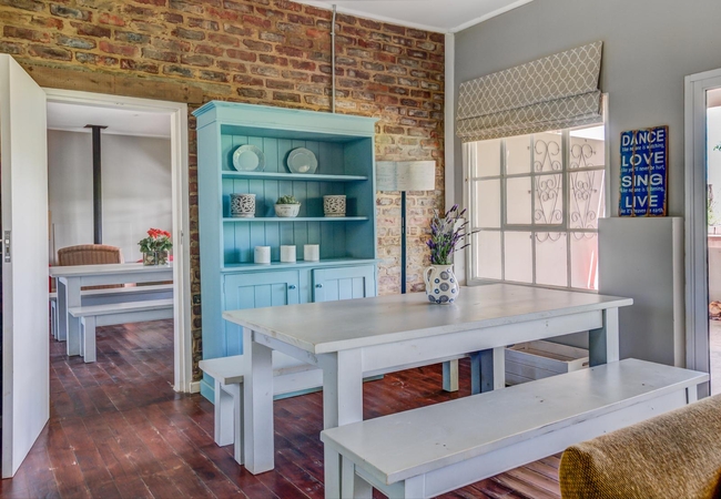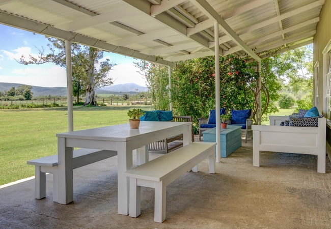 There is a well equipped kitchenette, a comfortable living area and a fireplace. Outside there is a patio with braai facilities and views out over the farm and mountains in the distance.