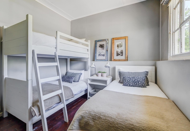 The main bedroom is furnished with a double bed while the second bedroom is furnished with a single bed and bunk beds with ladders. Linen and towels are provided. The bathroom is fitted with a shower, toilet and hand basin.