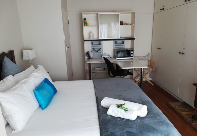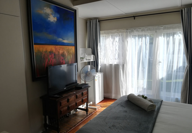The AppleBee Annex is a newly renovated room in the main house with a private entrance. Even though it is furnished with a queen bed in the bedroom and is only available for single occupation. It has a wet-room en-suite bathroom fitted with a shower, toiet, and basin. There is full DSTV, a desk, couple of chairs, Wi-Fi, microwave, toaster, kettle, bar fridge, electric blanket, fan and heater, hairdryer, etc. You may hear some normal house noise.