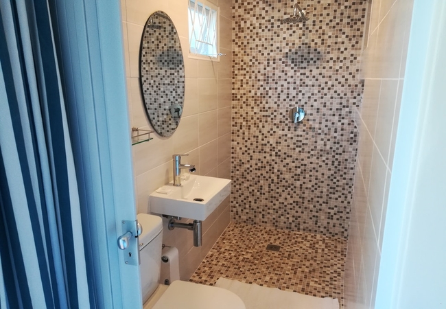 AppleBee III is a lovely sunny space full of windows with a large carpeted bedroom and garden/pool view. It is furnished with a King-size bed (can be converted to twin beds, if required). The full en-suite bathroom is equipped with a bath tub, shower, hand basin and WC. There is a single bed in the tiled lounge area, suitable for a child. i.e. you need to pass through the main bedroom to access the bathroom. Set up for semi-self-catering with everything required, including a table to work at, fridge, microwave, toaster, kettle, single induction plate with pots and pans, electric frying pan, fan and heater, electric blankets, etc.