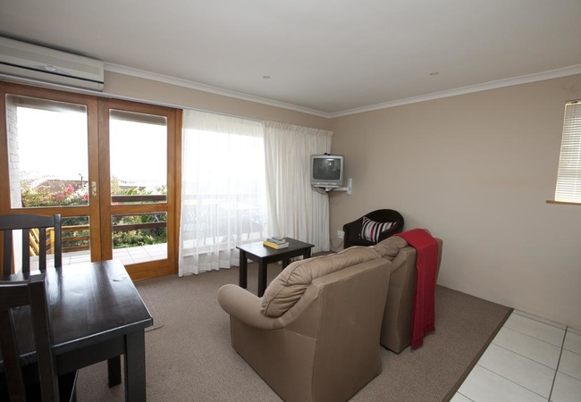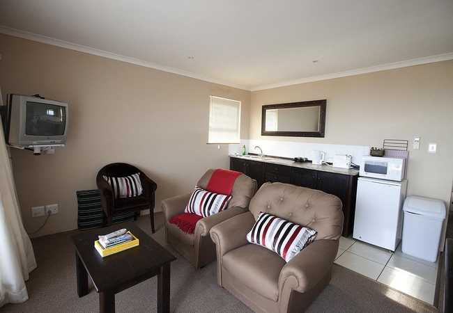 This suite has a Queen-size bed, a separate entrance and a terrace with sea views. There is air-con and an en-suite bathroom with a shower, toilet, basin and a hairdryer. The fully equipped kitchenette contains a toaster, kettle, microwave and a fridge. Guests can relax in the lounge / dining room with DStv, Wi-Fi and a safe.