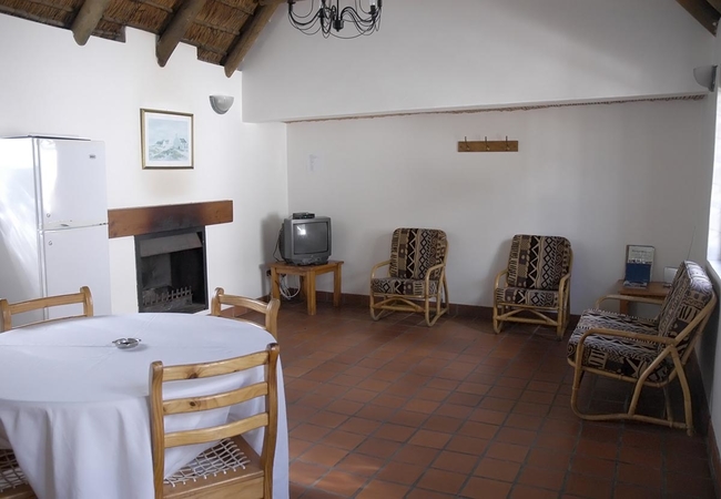 Our open-plan cottage, featuring a comfortable living room with a fireplace and an open-plan kitchen, and an outdoor barbecue area under a thatched lapa. There are two comfortable bedrooms with reed ceilings.
