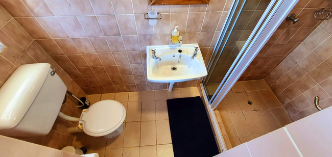 The apartment features three tastefully furnished bedrooms and two bathrooms. The main bedroom offers a queen-size bed and an en-suite bathroom with a shower, basin, and toilet. The second bedroom contains two single beds, while the third bedroom includes a double bed, and these two rooms share a bathroom equipped with a bath, basin, and toilet.