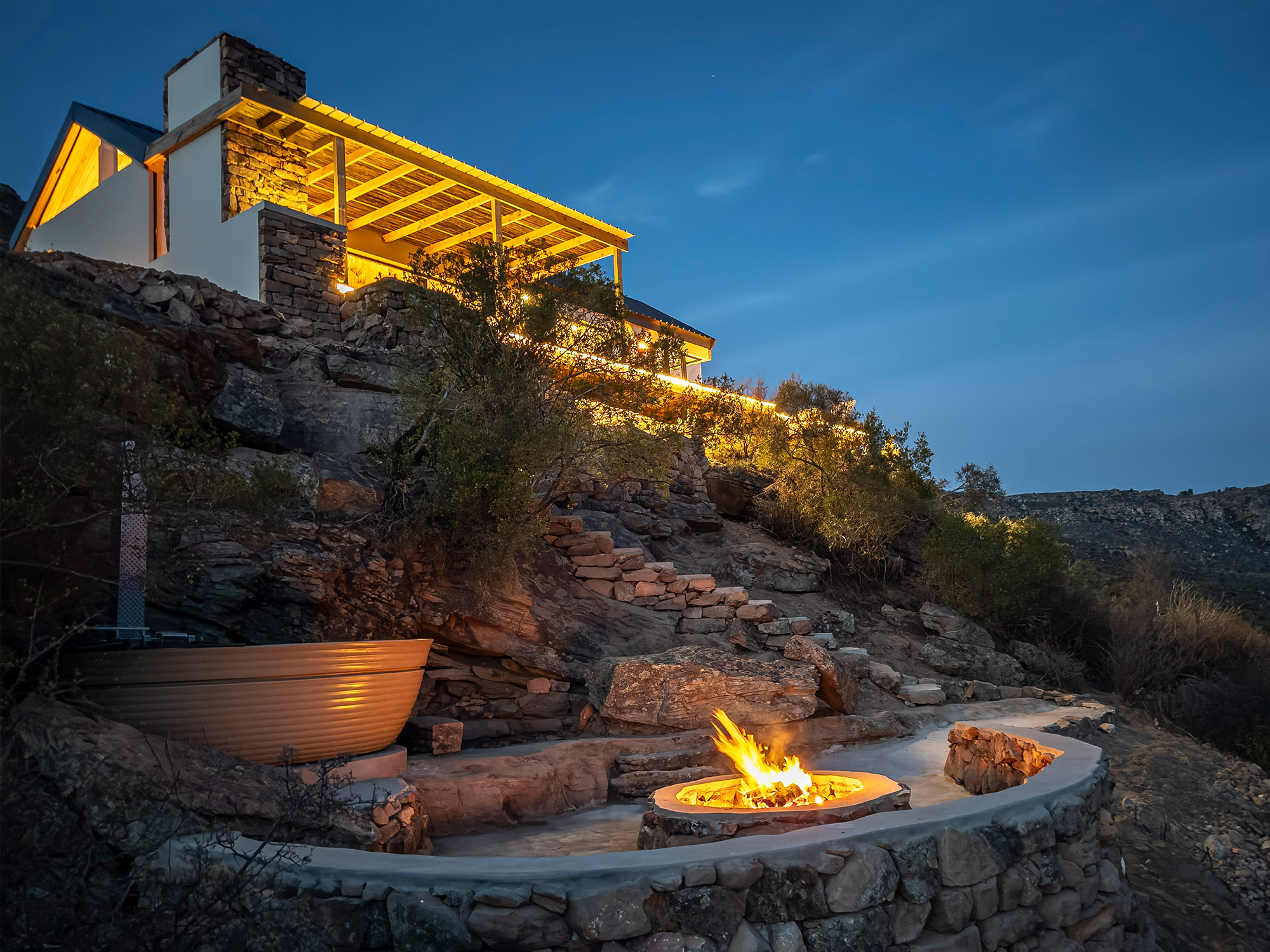 Guests can enjoy a private deck complete with a braai area and a wood-fired hot tub, ideal for stargazing or relaxing after a day of outdoor adventure. Added comforts include binoculars, a birdwatching guidebook, and solar-powered energy for sustainable living. River access is available, and pets are welcome by prior arrangement.