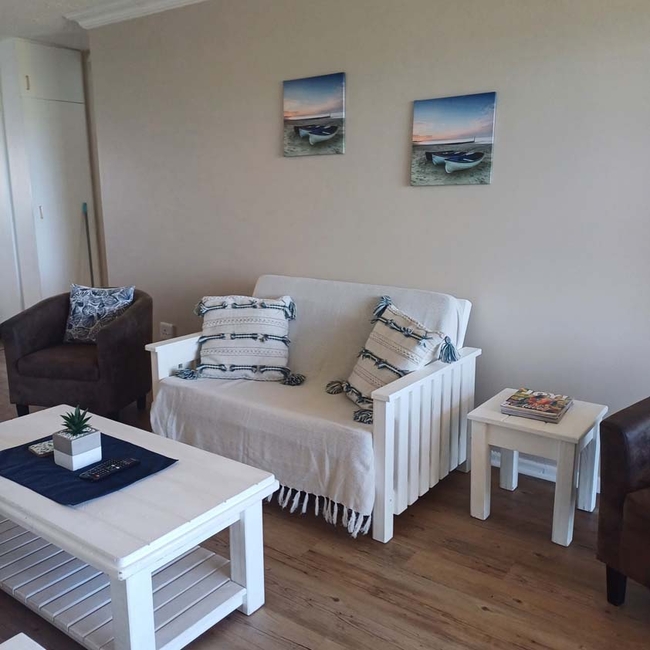 The apartment comfortably accommodates up to six guests and features two tastefully decorated bedrooms and two bathrooms. The main bedroom is furnished with a double bed and has an en-suite bathroom fitted with a shower, basin, and toilet. The second bedroom includes two single beds and makes use of a separate bathroom fitted with a bath, shower-over-bath, basin, and toilet. Linen is provided, though guests are asked to bring their own towels. The fully equipped kitchen includes a fridge-freezer, stove, oven, microwave, dishwasher, washing machine, and all basic cutlery, crockery, and tea- and coffee-making facilities. It flows into a cosy lounge area furnished with comfortable couches and a double sleeper couch for two additional guests. The lounge is fitted with a TV offering selected DStv channels. An indoor braai area with ample seating is ideal for relaxed family evenings, while large sliding doors open up to reveal lovely sea views and the refreshing coastal breeze.