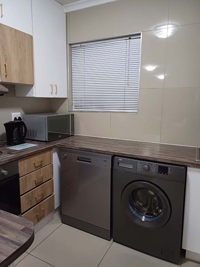 The kitchen is fully equipped and includes a fridge freezer, stove, oven, microwave, dishwasher, washing machine and all essential cutlery, crockery and tea and coffee making facilities. This practical space leads into a cosy lounge furnished with comfortable seating and a double sleeper couch that can accommodate two extra guests. A TV with selected DStv channels is also provided.