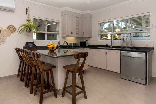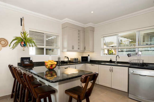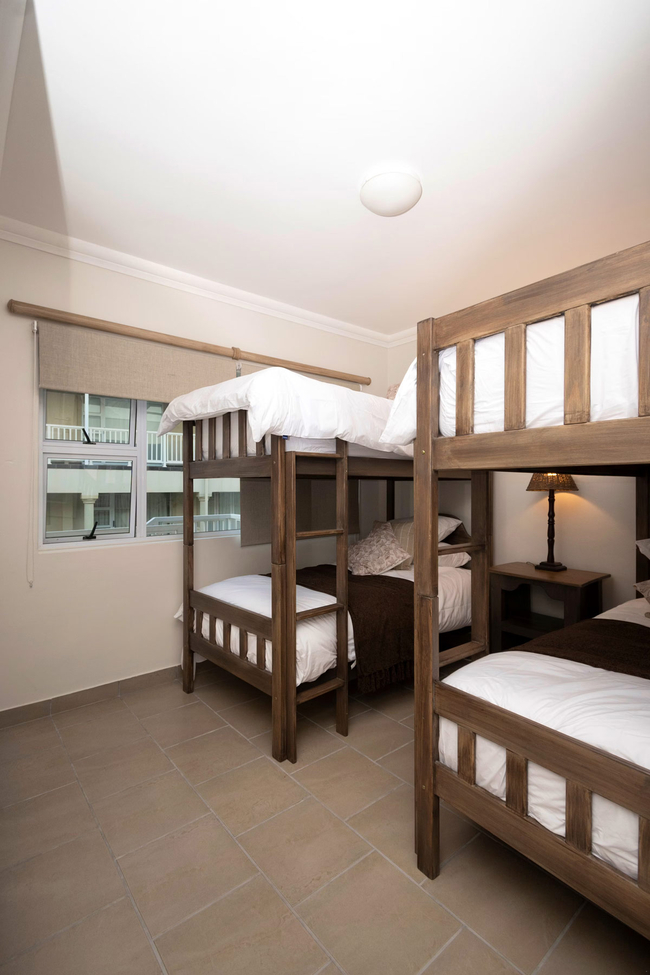 Designed to accommodate up to eight guests, the apartment comprises three comfortable bedrooms, each with its own private en-suite bathroom. The main bedroom features a queen-size bed and a bathroom equipped with a shower, basin, and toilet. The second bedroom is fitted with a double bed, while the adjoining bathroom also includes a shower, basin, and toilet. Perfect for children or additional guests, the third bedroom offers two bunk beds, with its en-suite bathroom featuring a bath, shower, basin, and toilet. Quality linen and bath towels are provided for convenience, though guests are kindly reminded to bring their own beach towels. The air-conditioned, open-plan living area combines contemporary comfort with functionality. The modern kitchen is fully equipped with essential appliances including a fridge-freezer, oven, stove, microwave, dishwasher, and a complete range of crockery and cutlery. A breakfast bar with stools provides a casual dining option, while the adjacent lounge area offers plush seating, a smart TV with streaming capabilities, and complimentary Wi-Fi to keep guests connected and entertained. Outdoors, a spacious wrap-around balcony beckons with uninterrupted 180-degree sea views. Here, guests can enjoy relaxed alfresco meals, thanks to the comfortable seating and built-in braai facilities, while taking in the gentle sea breeze and rhythmic sound of the waves. The apartment also offers access to a communal swimming pool and additional braai areas, games room and laundromatter within the complex, along with secure on-site parking for peace of mind.