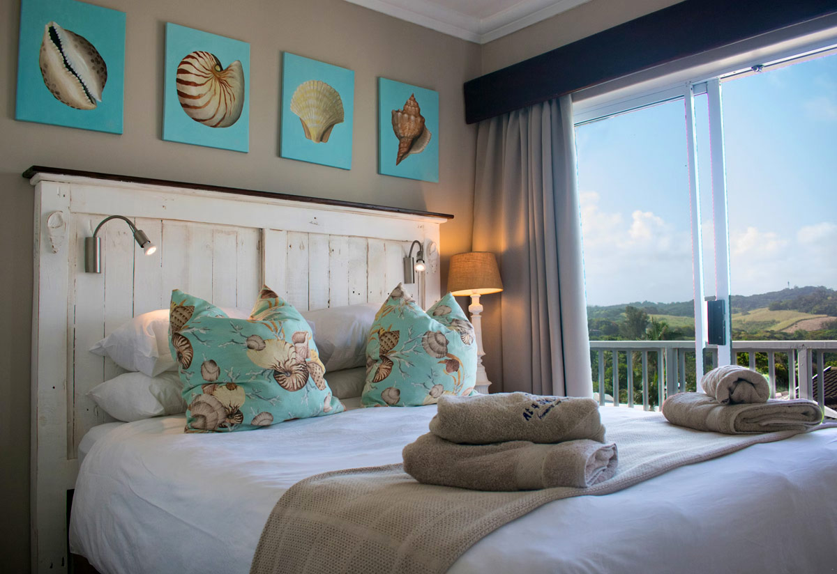 At 4 Umzumbe has three bedrooms. The main bedroom is furnished with a Queen-size bed and has an en-suite bathroom. The second bedroom has a Queen-size bed and the third room two single beds. There is an additional full bathroom for the second and third bedrooms. All rooms have 100% white cotton percale hotel quality linen. The kitchen and living areas are open plan and lead, through folding doors onto the covered patio. The kitchen is fully equipped for self catering with a microwave, fridge, freezer and dishwasher. Full bouquet DStv is provided for our guests and there is also a DVD player for their use. The unit has air-conditioners for humid coastal days. The unit has secure parking.