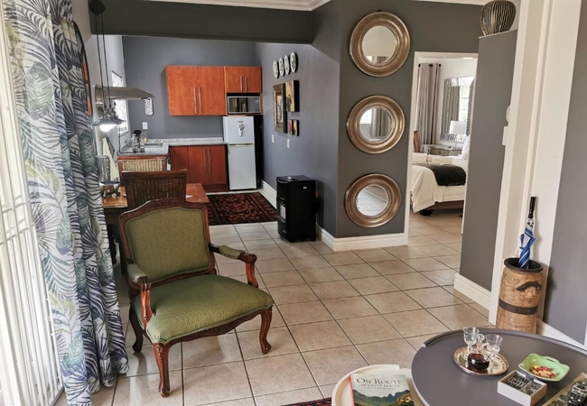 With a patio overlooking the garden and fountain area, the suite offers the sounds of relaxation and allows for privacy. This two-bedroom suite has one bedroom furnished with a Queen-size bed and the second bedroom is furnished with a double bed. The bathroom is fitted with a shower, hand basin, and toilet. There are an open-plan lounge and dining area, and a separate kitchen fitted with a stove, oven, fridge-freezer, and microwave.