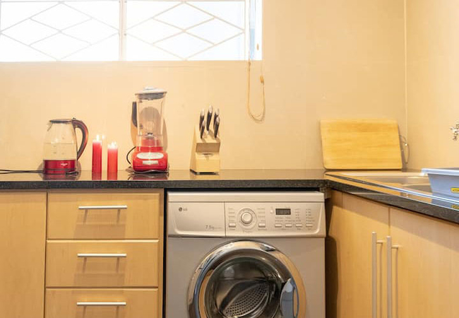 The kitchen is fully equipped with a hob and oven, large fridge and freezer and good quality pots and pans and utensils. There is a small dining table where you can enjoy your meals. The comfortable living area has a flat screen TV and Wi-Fi.